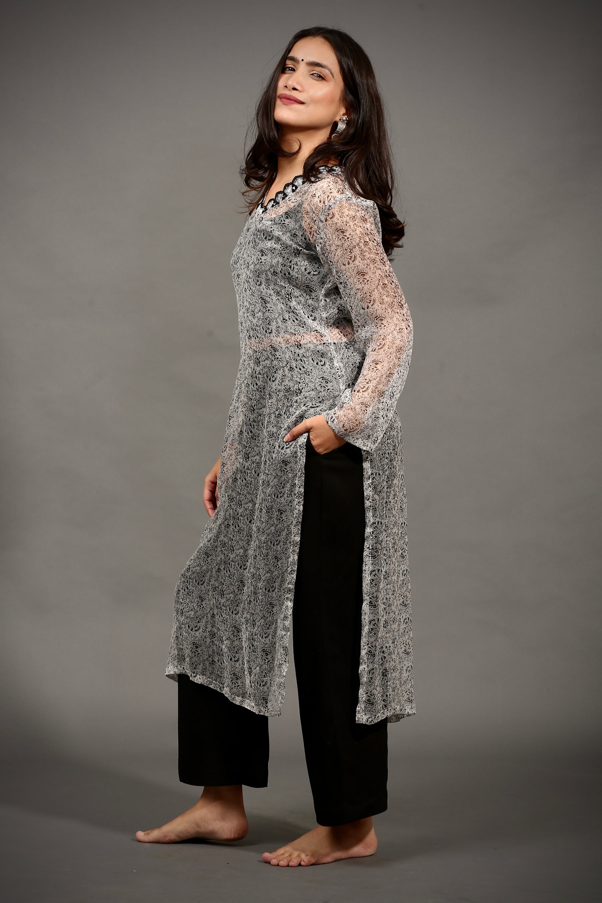 Grey chiffon kurta, black smocked crop top & pants (Set of 3)