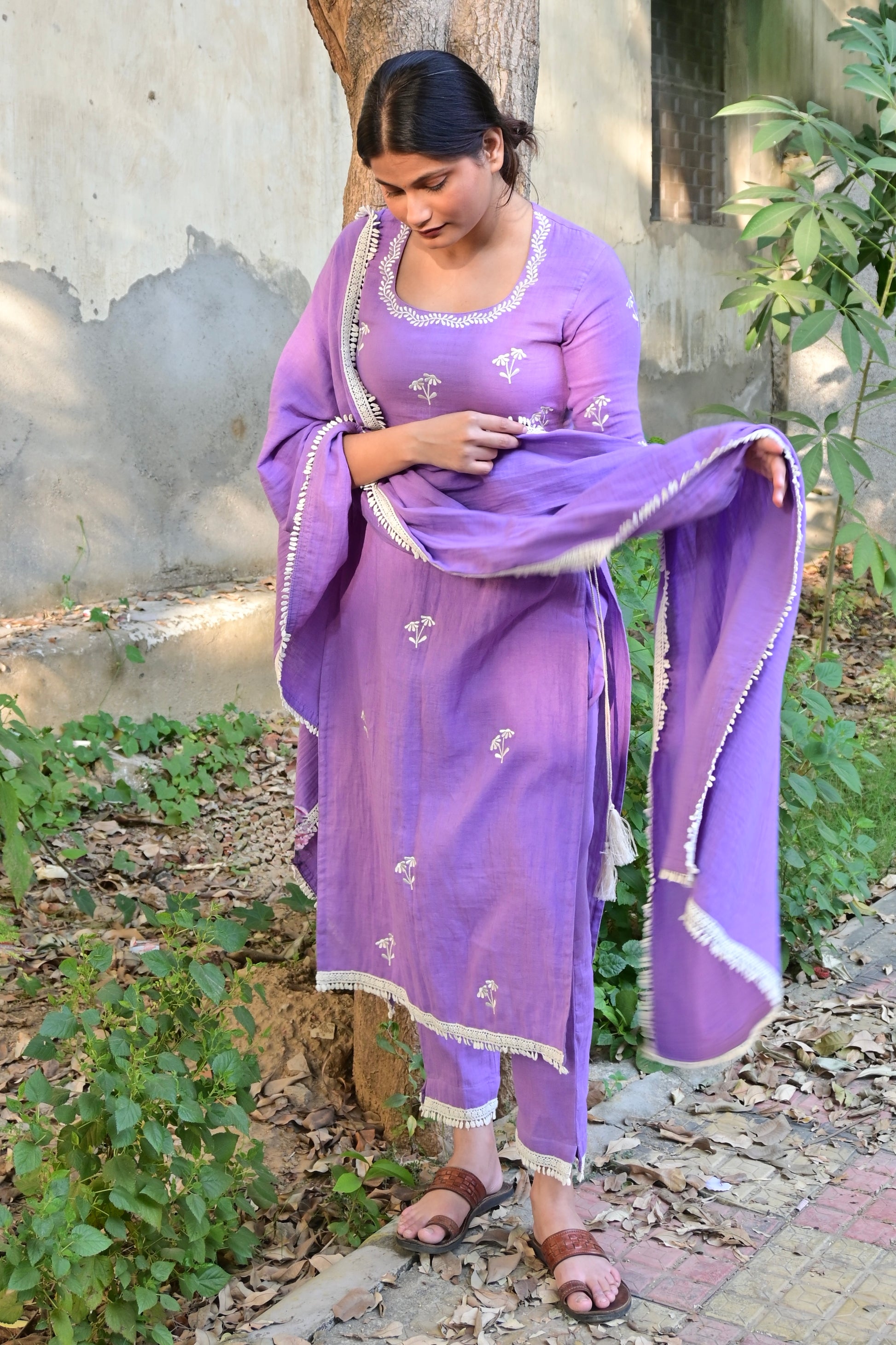 Lavender Floral Embroidered High Slit kurta Set